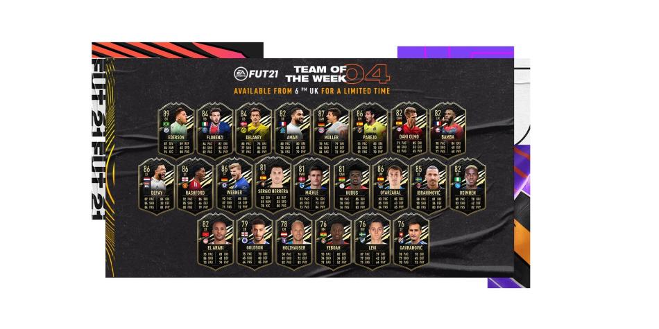 EA Sports reveló el TOTW 04 para los sobre de Ultimate Team. Entre los jugadores más importantes y destacados están el arquero Ederson, el defensa italiano del PSG Florenzi y los delanteros Rashford, Werner, Ibrahimovic y Oshimen.