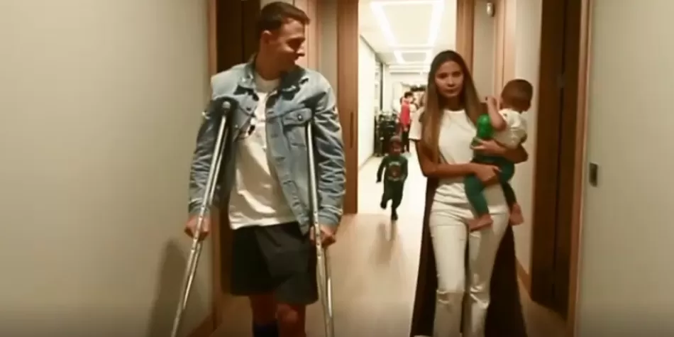 Él mismo compartió el momento de su llegada, en muletas, y en compañía de su familia.