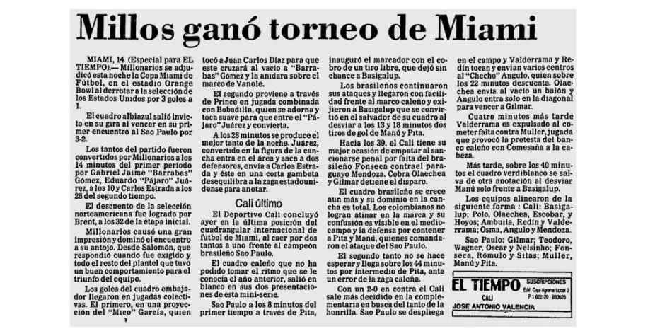 Esta historia sucedió hace 33 años. El 14 de marzo de 1987, Millonarios quedó campeón de la Copa Miami, un torneo amistoso en el que también participó la selección de Estados Unidos; Sao Paulo, recién campeón de Brasil en aquel momento; y el Deportivo Cali.