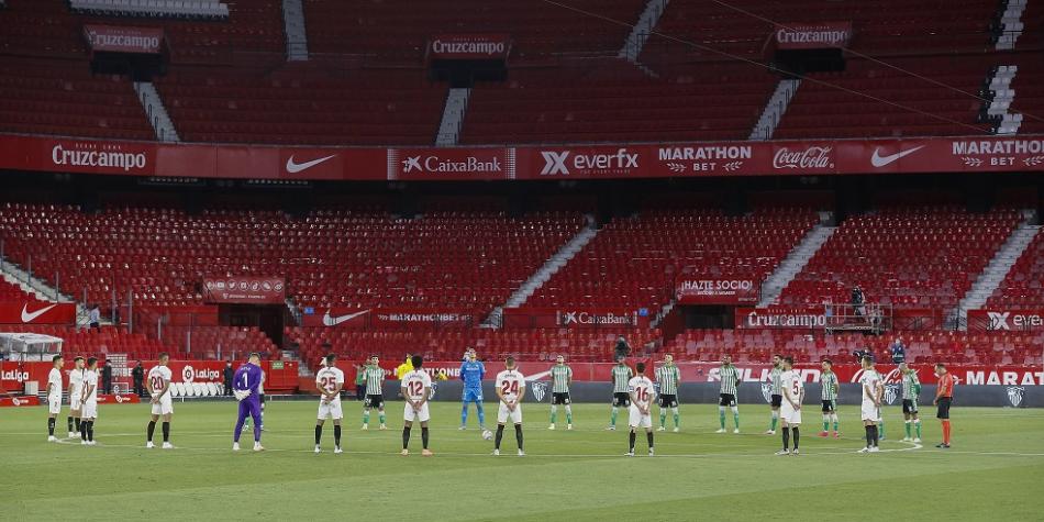 Con una imagen insólita para un derbi, sin aficionados en las gradas por las medidas de seguridad sanitaria contra el covid-19, en el Ramón Sánchez-Pizjuán se reanudo la liga en Primera División con un minuto de silencio sepulcral, en el que no se oyó nada, ni el revoloteo de los pájaros, para honrar la memoria de los miles de fallecidos por la tragedia desencadenada por la pandemia.