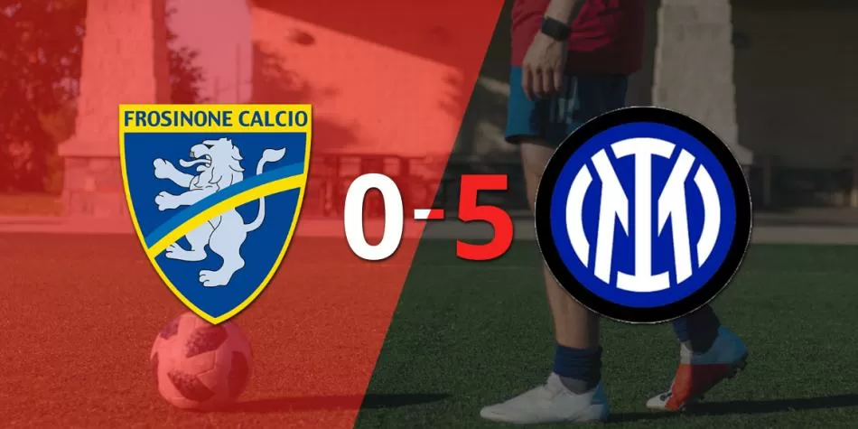 En la fecha 36 del torneo Italia - Serie A 2023-2024, Frosinone fue goleado este viernes por 5-0 por Inter en el estadio Benito Stirpe. Davide Frattesi (18' 1T), Marko Arnautovic (14' 2T), Tajon Buchanan (31' 2T), Lautaro Martínez (34' 2T) y Marcus Thuram (38' 2T) fueron los autores del aplastante triunfo de Inter en el estadio Benito Stirpe.
